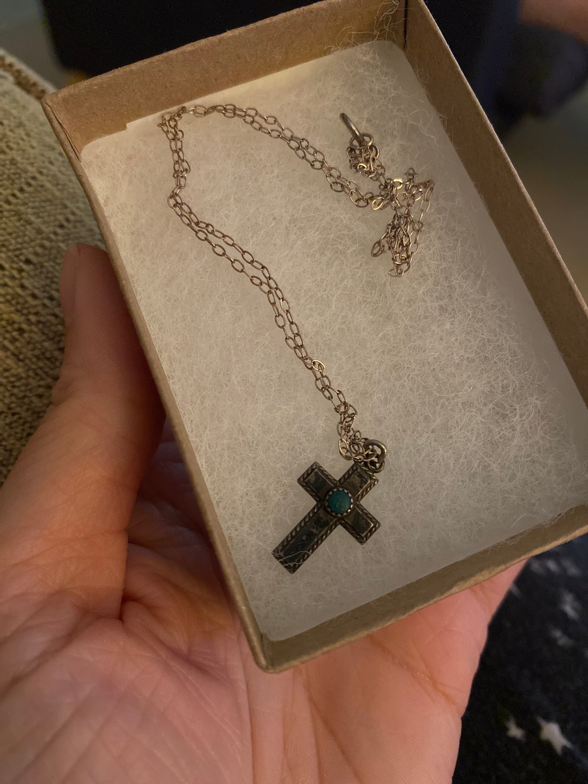 Here we have a small, super lightweight cross pendant made with a small dot of green turquoise, from the Fred Harvey era. Carries a sterling stamp on the back yet no maker's mark, so we call it Southwestern. The turquoise color is a deep green. The cross has been paired with a very delicate silver chain.