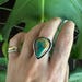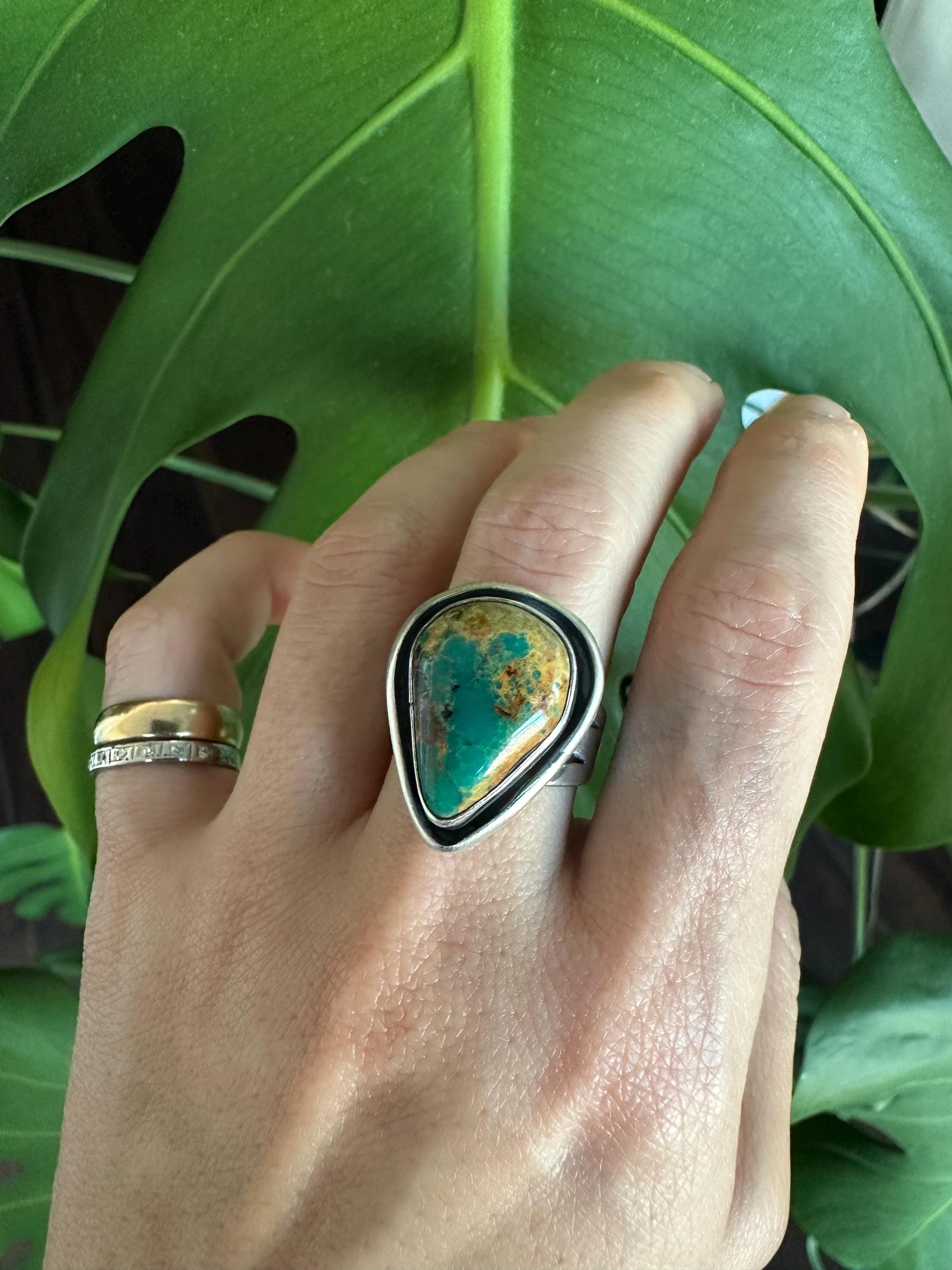 The ring is Size 6 on the sizer, and the ring face measures about 3/4" wide at the widest point by just under 1" long. The turquoise extends just over 1/4" from the backplate. Weighs 10g.