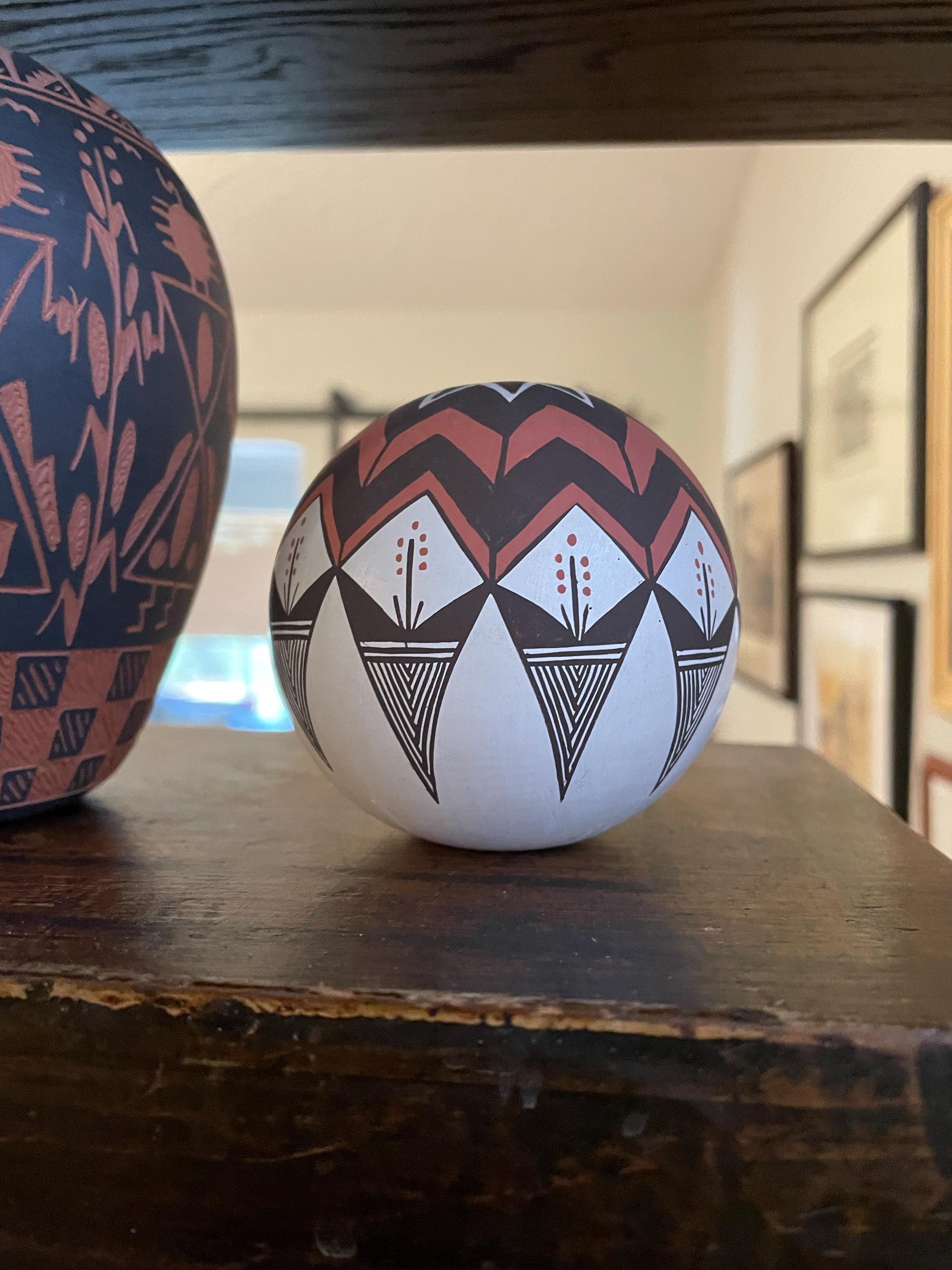 Here we have a lovely small seed pot vase with dark brown and ochre painted designs against the white slip. The pot, at least to me, represents the bounty of harvest and the importance of cultivation in the repeating corn stalks forming a ring around the center, and above the corn is a starburst geometric design above and around the opening. This small pot is hand shaped, as we can feel the inconsistencies inside. The signature on the bottom is P. Iule, and Acoma, N.M. Has some spots where the paint has been scuffed and notice the dot of white in the starburst around the mouth of the pot. I don't know if that was left there intentionally or not. Often a small flaw will be left in a pot by design.