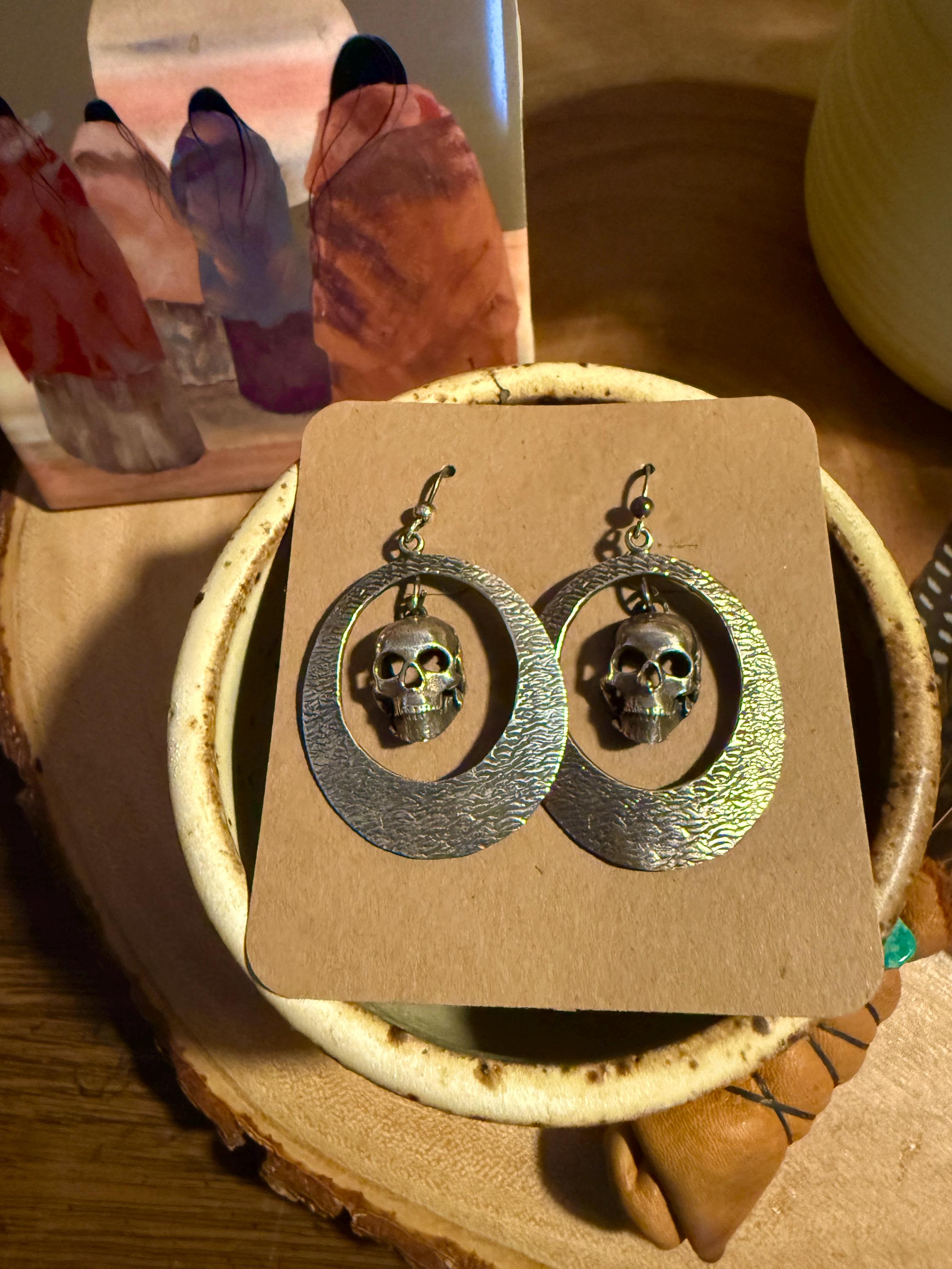 These vintage sterling silver earrings feature a textured hoop from the center of which dangles skull--a great combination of retro style and cultural flair. The cast skull has a great realistic look to it, and it conjures notions of Day of the Dead, Mexican culture, and steampunk sensibility. One of the hoops has a very faint STERLING mark.