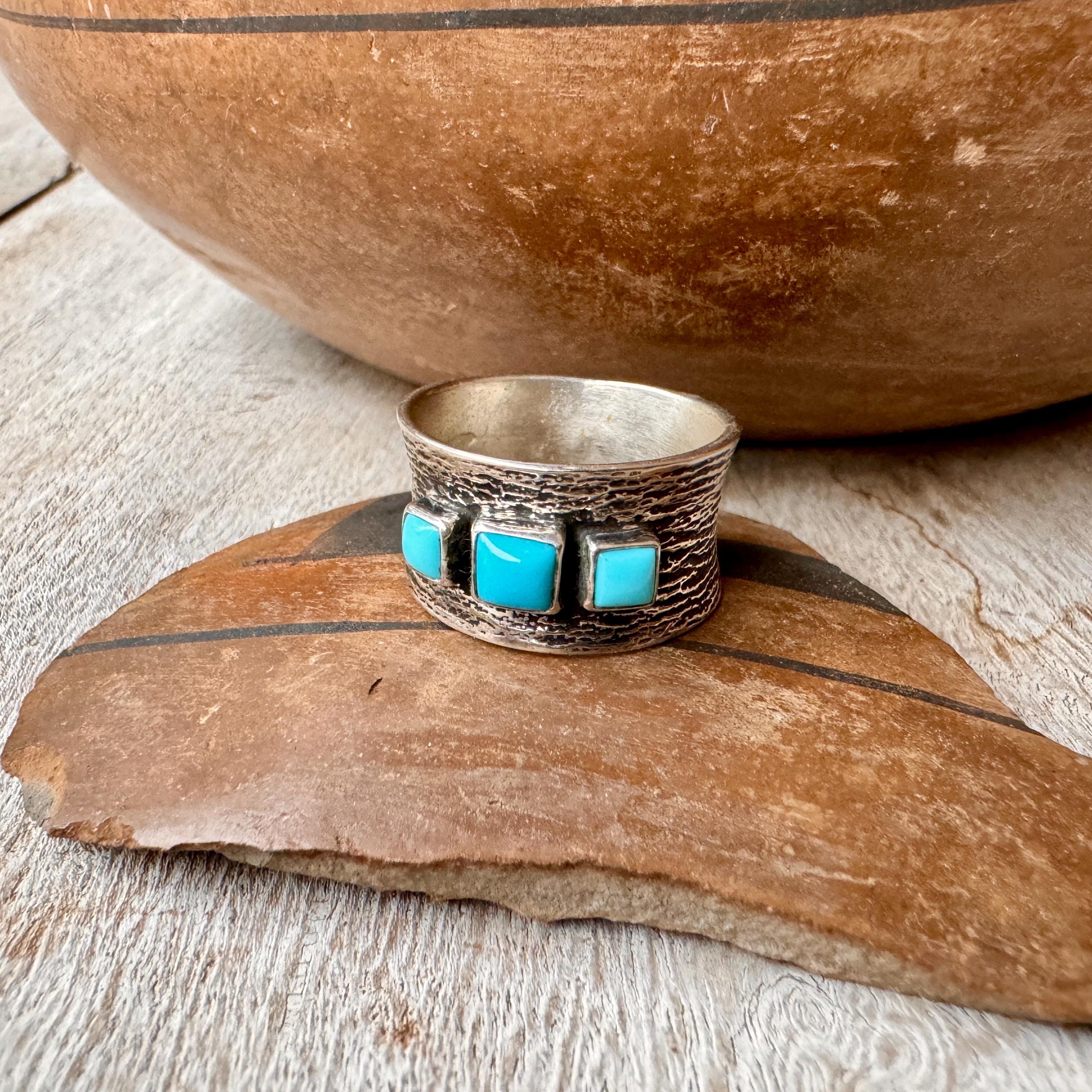 This vintage sterling silver band is slightly flared, and on the front are three square-ish bezels of turquoise, all bright blue, that textured background oxidized for contrast. The ring reminds me of contemporary Southwestern wedding bands, and with those flared edges also an elegant look. Carries some picto hallmarks, which I've not been able to identify, along with a STERLING mark. Likely is Navajo made.
