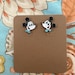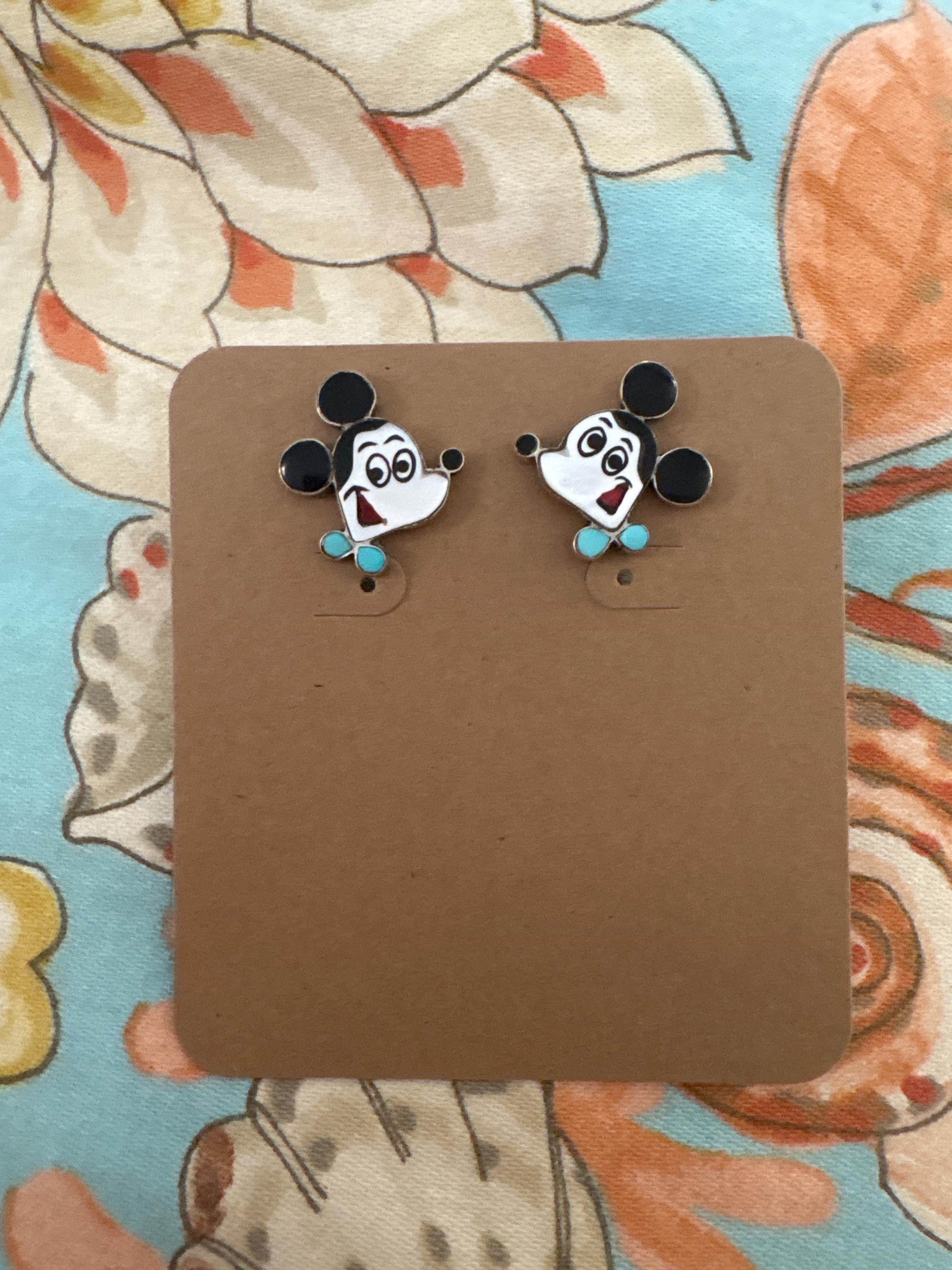 These vintage earrings feature a childhood character in the form of a famous Mouse. Relative small posts, they consist of a sterling silver cut out of the mouse's head, inlaid with Mother of Pearl, onyx or black jet, turquoise for the mouse's bowtie, and a hint of coral for its mouth or tongue. These depictions were popular and done by Zuni silversmiths, especially in the 1950s through 1970s. In the 1970s, Disney attempted to stop production of these characters but because they were re-interpreted and not direct copies, the company was unsuccessful, although one can't use the character names in describing them. Native American depictions of Disney characters are termed "Zuni Tunes," a play on the term "Looney Tunes" (or Toons, meaning cartoons). These pieces are highly collectible, especially the face of the Mouse. Each earring is etched "ZUNI NM" and the date, which appears to be '87. The earrings came from a liquidated trading post, and I have two pairs; both are "dead stock," meaning they were never worn.