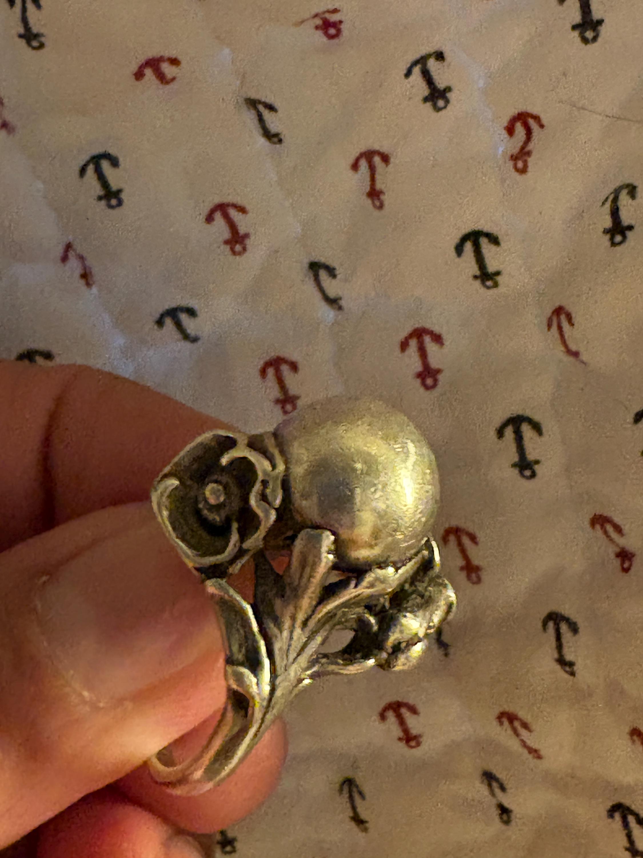 This vintage sterling silver ring is lovely, made in the 1980s but with a nod to Art Nouveau era designs. The ring features a hollow ball of silver enveloped in a sculptural floral bezel. Look at each side of the ring and you'll see flowers, leaves, and what looks almost like metal art. Perfect gift for a gardener or someone who loves flowers. The back carries what appears to be an illegible maker's mark, and the interior of the band has a STERLING stamp.
