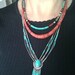 This five-strand "liquid silver" and turquoise heishi bead necklace looks even better on, and it comes with a matching bracelet. "Liquid silver" is the term used to describe silver heishi beads, the small tubular beads that when strung together seem to form a flow of silver. Liquid silver is elegant yet understated. It can dress up jeans or bring a boho look to a summer dress or velvet skirt. These pieces have the added great look of turquoise cabochons woven into the design. Both have STERLING stamps on the back.