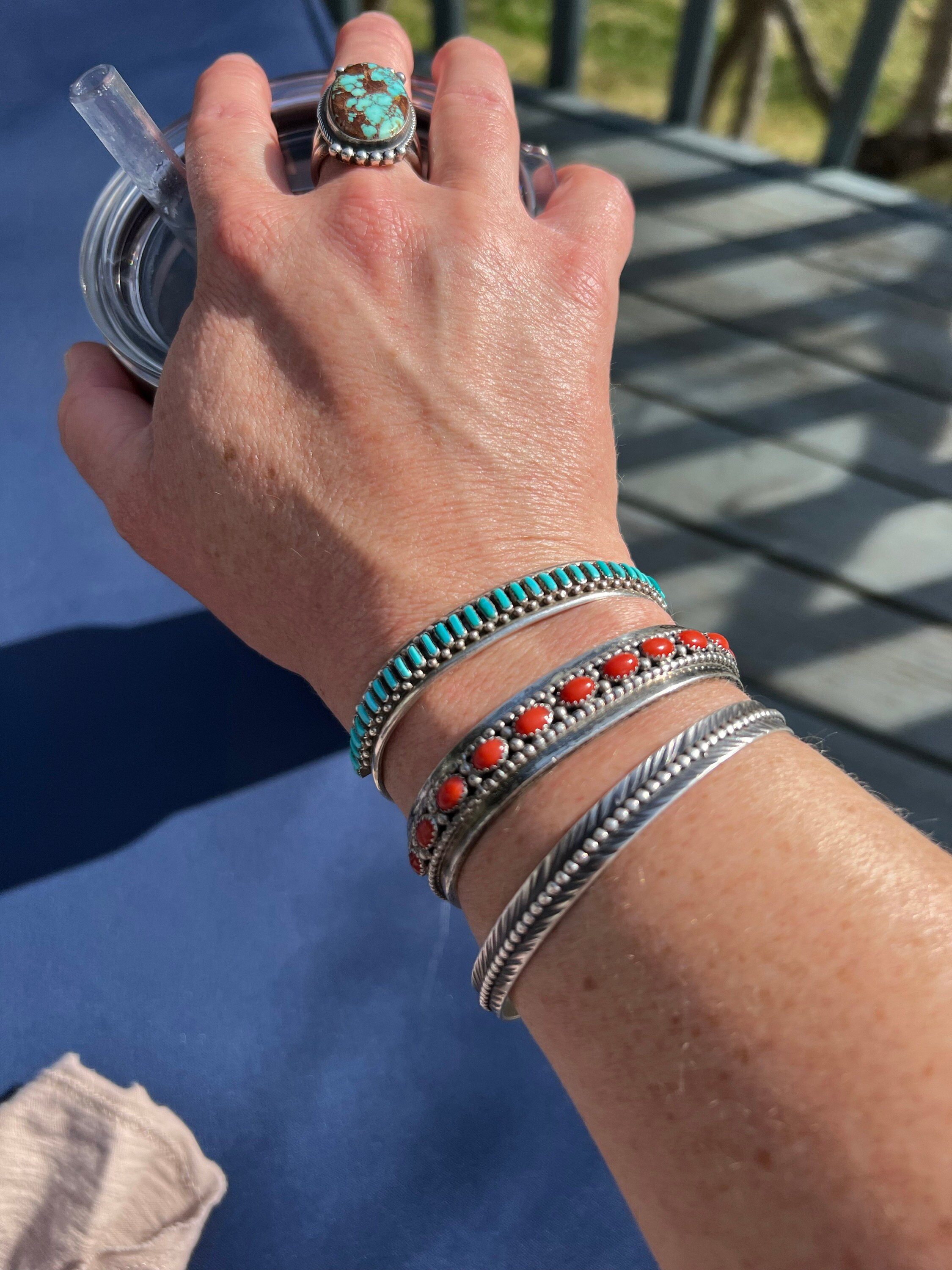 When I first started selling vintage turquoise jewelry, these pieces were not all that uncommon to find. But over the past years, they have been few and far between. This particular piece features 32 slender and small cabochons of beautiful blue turquoise, each dotted on either side with a silver raindrop. This type of setting is known as "needlepoint" in Zuni jewelry making. Notice the one bezel at each end that is positioned vertically instead of horizontally--a nice touch that makes the piece different and special. The interior carries the hallmark AH; this is the second piece by that artist that I've sold, and I've not been able to confirm the identity of the maker. Looks great when worn in a stack, but it's also a lovely statement when worn alone.