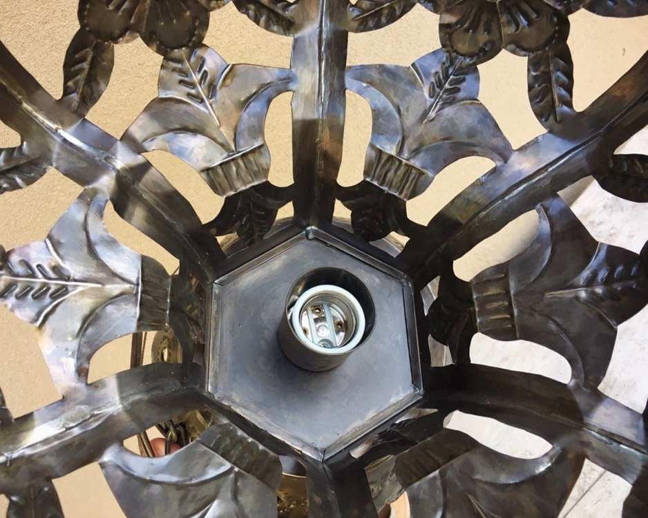This fabulous vintage metal hanging lamp came from a home in New Mexico, having hung for many years in a small entry way. From Mexico, the piece is made of a bronze colored thin metal, possibly tin, with decorative cut-outs and punched designs. We believe this is likely 1960s to 1970s given the older Underwriters sticker for the actual light bulb attachment and the attached metal maker's mark for the metal fixture. Includes the wiring although we have not tested it to see if it still works. The person I bought it from said it was in working order up until the time they took it out of the home (they were moving and thought they'd use it in their new home, but since they couldn't match it they never did use it). The metal has dents from age and wear.