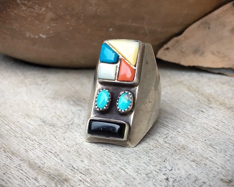 This vintage turquoise ring is not only huge but has huge presence, with multiple stones such as black onyx, yellow and white Mother of Pearl, and coral. The stones are set out in a geometric design along a very long ring face. The sterling silver band or shank is traditional although much larger than usual, long and perfect for the person who likes the feel of a big ring. The silver along the bottom of the band has thinned from wear. We estimate this ring to be circa 1960s to 1970s. The piece is unsigned, and it could be Navajo or Zuni, as both are known for this style.