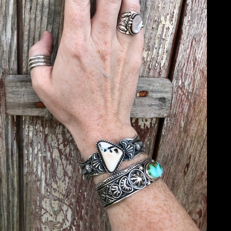 This sterling silver cuff bracelet is made with White Buffalo turquoise, and before I go further I should point out that there is some debate as to what we call White Buffalo. Since there is such a thing as White Turquoise, which mined from several turquoise mines, such as Dry Creek and Sacred Buffalo, the stone is this ring is often referred to as White Buffalo, as it comes from a mine by the same name in Tonopah, Nevada. It lies in veins like turquoise and is surrounded by black chert, and it polishes like turquoise. Made by Navajo silversmith Keith Billah.