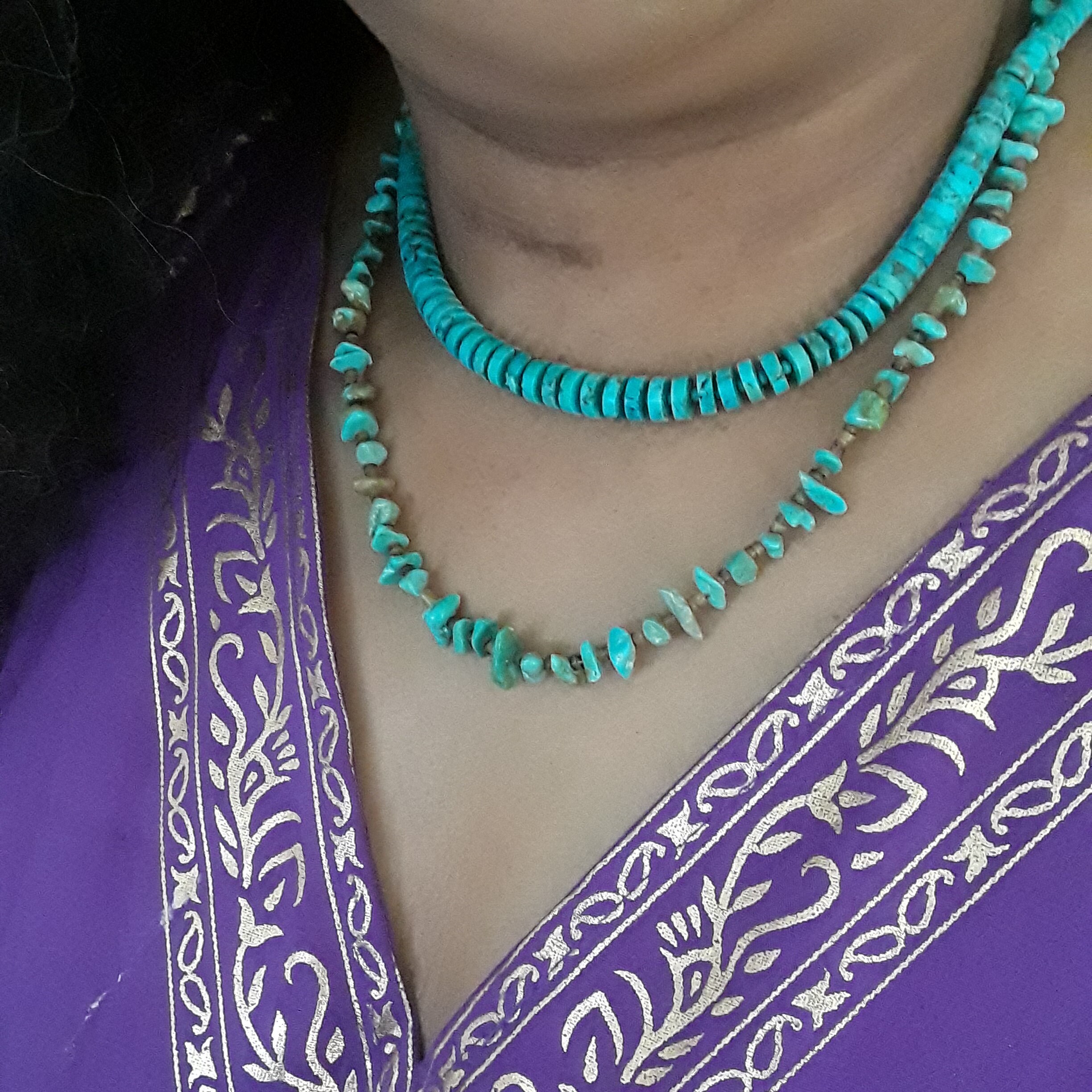 This turquoise necklace is not large yet it is lovely, with smallish pieces of turquoise, what we call "chip turquoise," with dark shell heishi spacers. As you move up the necklace, the turquoise becomes just slightly smaller, then finished off with just heishi. The findings are not sterling silver. A great piece for someone who loves to layer turquiose necklaces.