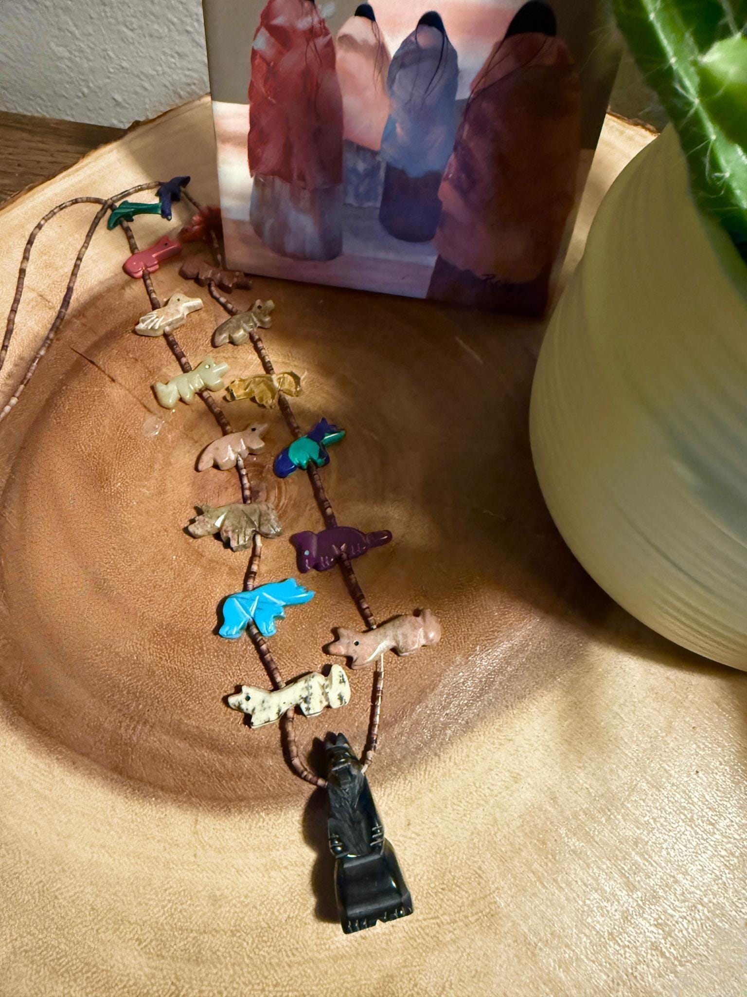 The necklace measures just under 29" end to end, and the bear fetish at the bottom is 1-1/2" tall by 1/2" wide. Weighs 39g. Although there may be a tiny tip that's been knocked off, the animals all appear to have their bits and parts.